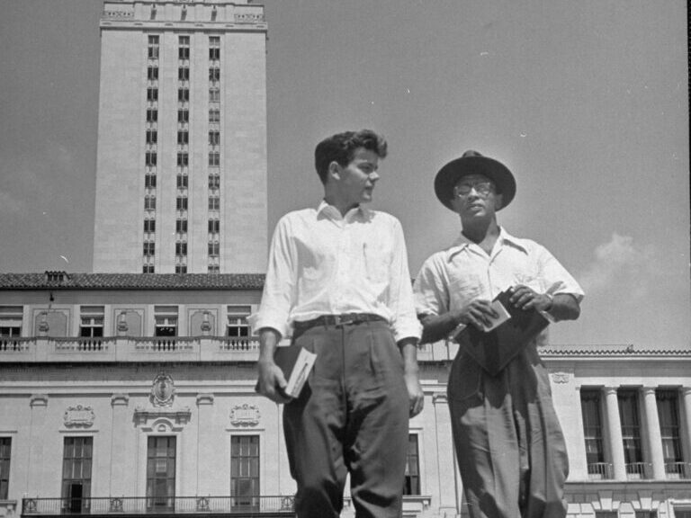 Daily Texan Editor Ronnie Duggar & Heman Marion Sweatt in front of the UT Tower. Photo by Joe Scherschel, 1950, The LIFE Picture Collection/Shutterstock (12147836a).